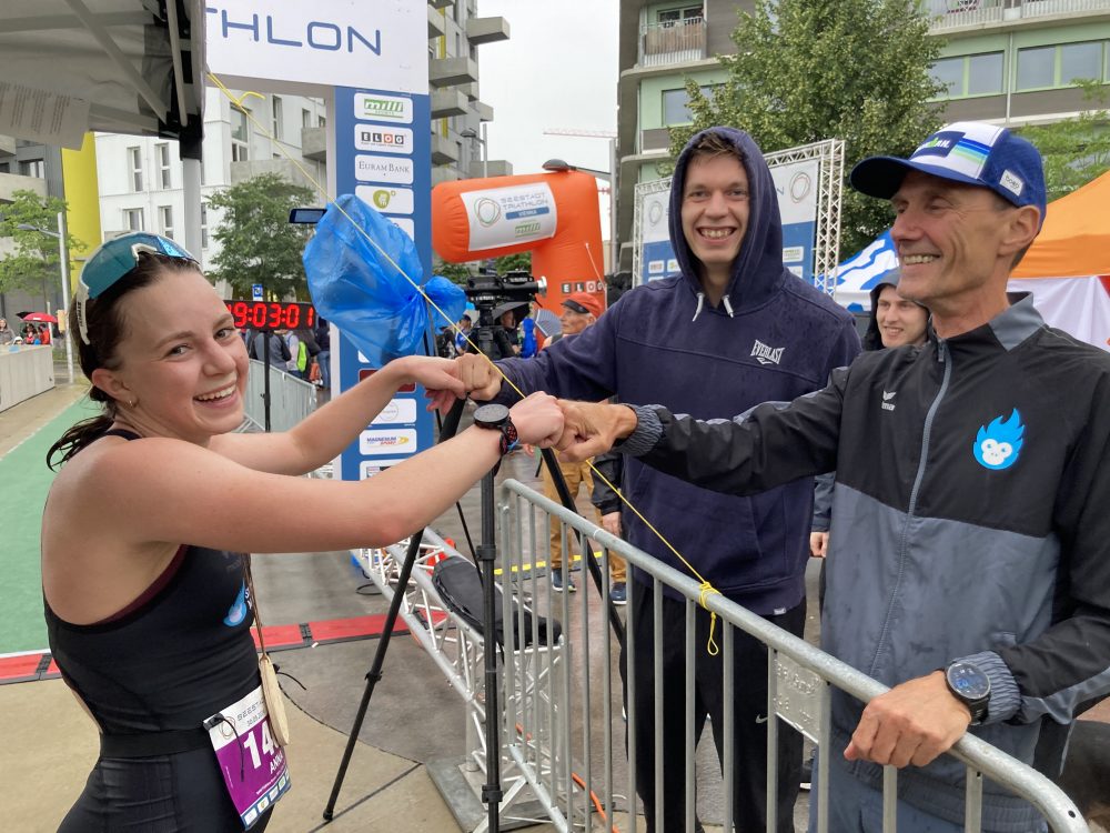 Zurück zum Rennen: Anna, mental sehr stark und gut vorbereitet wechselte in Profimanier und startete hervorragend ins Regenrennen. Sie hatte ihre Konkurrentinnen aufgrund des „Hoppalas“ ziehen lassen müssen, profitierte aber im weiteren Rennverlauf vom Sturz von Carolina Schiefer vom TRI-X- Kufstein und fuhr ab diesem Zeitpunkt ein Solorennen Richtung zweiten Wechsel. Einem perfekten Abstieg vom Rad folgte ein gelungener, schneller Wechsel. Danach wurde beim Lauf nichts mehr hergeschenkt und grandios die Ziellinie überlaufen. Von hinten drohte da keine Gefahr mehr, und vorne war ebenfalls alles klar.