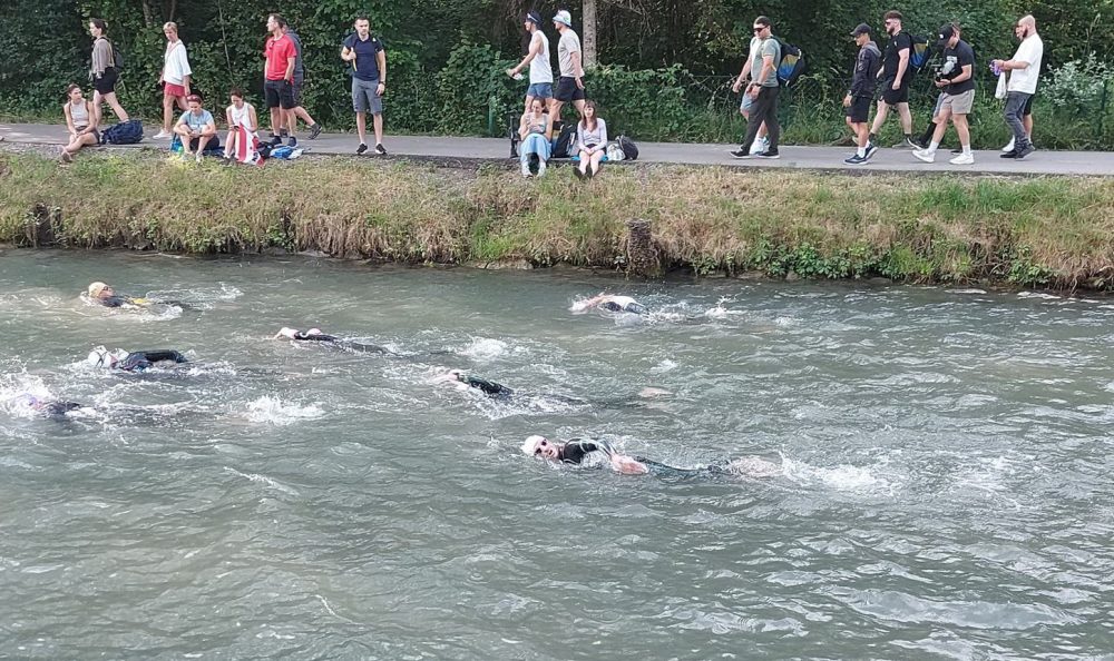 Für das Schwimmen habe ich mich im Block für eine Zeit zwischen 1:00 h und 1:10 h eingeordnet und habe ständig Leute überholt, was mir schon mal ein positives Gefühl gegeben hat. Im Lendkanal habe ich dann am Rand Simone erkannt, ihr zugewunken, und habe dann bis zum Ausstieg so gut es ging weiter Leute überholt. Am Ende stand eine Schwimmzeit von 1:06:05, mit der ich einigermaßen zufrieden war. Den langen Weg in die Wechselzone habe ich dank Tipp von Simone für das erste Gel genutzt und habe mir dann in der Wechselzone keinen Zeitstress gemacht, wollte aber dennoch so effizient wie möglich sein, was mir auch gelungen ist.