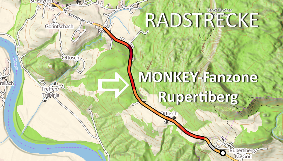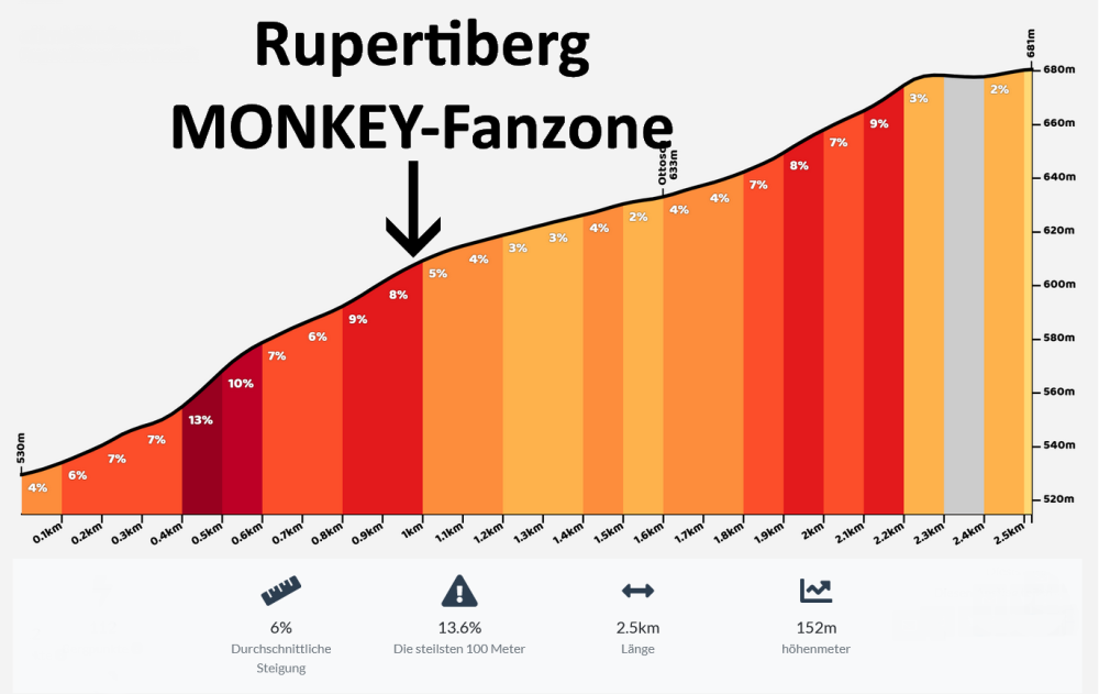 Die Fans/Rad angeleitet von Robert und dem Silberrücken, richten wir wieder eine Monkeys Fanzone nahe dem steilsten Stück und ca. einen Kilometer vor der Labe am höchsten Punkt vom Rupertiberg ein. Leicht zu erkennen durch unsere Beachflags! Bei den Fotos unten findet ihr eine Karte und ein Höhenprofil.