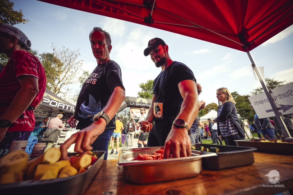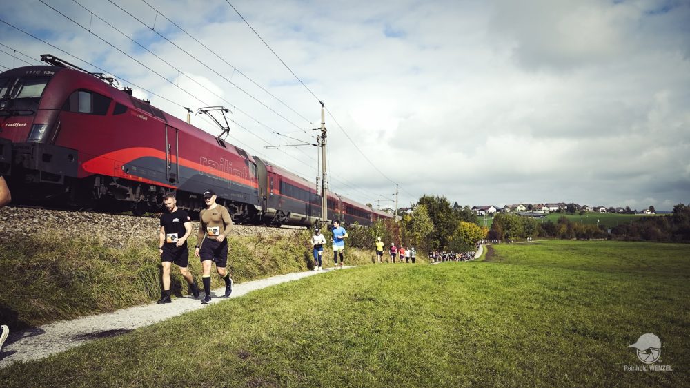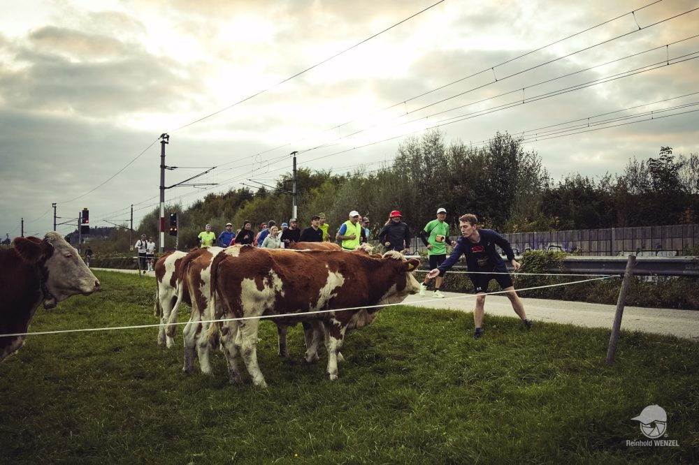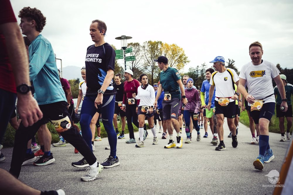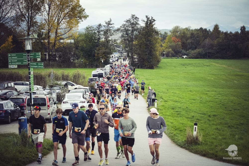 Start ist pünktlich um 9 Uhr. Eine flache Pendelstrecke führt entlang des Seeufers und wieder zurück zum Strandbad Seekirchen. Nach 300 Metern warten die ersten beiden Höhenmeter auf die Teilnehmer. Auf mich wartet das erste große Learning: Wenn die Steigung 0,5% übersteigt, wird gegangen – immer! Nur ein paar Übermotivierte laufen hier. Der Großteil der Laufstrecke ist so eng, dass man weite Teile nur in Zweierreihe laufen kann. Das hat den Vorteil, dass man nicht überpacen kann. Man konzentriert sich nur mehr auf die Beine des Vordermanns bzw. der Vorderfrau und versucht Steinen und Kuhfladen auszuweichen. Dass man beim Laufen schon mal in Trance verfällt und alles rundherum verschwindet, ist bekannt. So schnell wie hier passiert mir das selten. Alle Versuche, mit Meditation ähnliche Zustände zu erreichen, sind bisher gescheitert. Nach jeder Runde trinken und essen (ein Gel oder einen halben Riegel, 1-2 Stück Kuchen), pünktlich zur vollen Stunde läutet die Glocke die nächste Runde ein. Schon in der ersten Runde ist mir klar: Das werden heute keine 8 Runden – das schreit förmlich nach 10, WRU hin oder her.